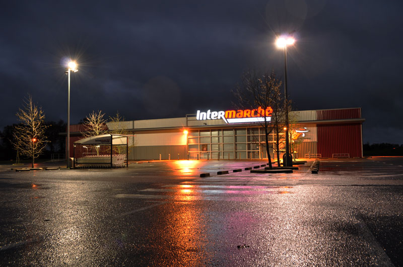 J'aime ces images frontales, de super marché,le soir, sous la pluie,