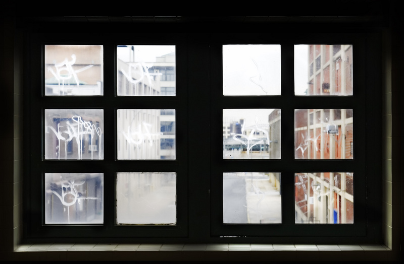 les grafitis sur les vitres sont amha intéressants mais pas assez lisibles il serait peut etre intéressant d'assombrir le dehors en gardant tel quel ces grafitis ....