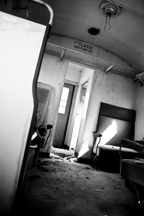 En effet, dans ce musée je ne pouvais pas pénétrer dans le wagon et j'ai du passer le bras au travers la vitre brisée (qui m'a valu une belle coupure à l'avant bras ). Difficile de cadrer mais surtout... Impossible de passer outre ce panneau blanc