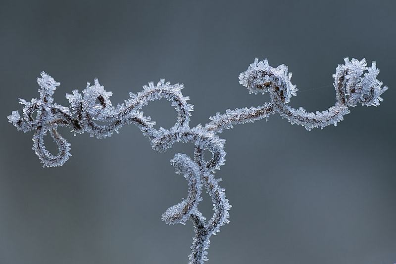 le rendu de cette branche givrée avec ce bokeh gris bleuté est beau