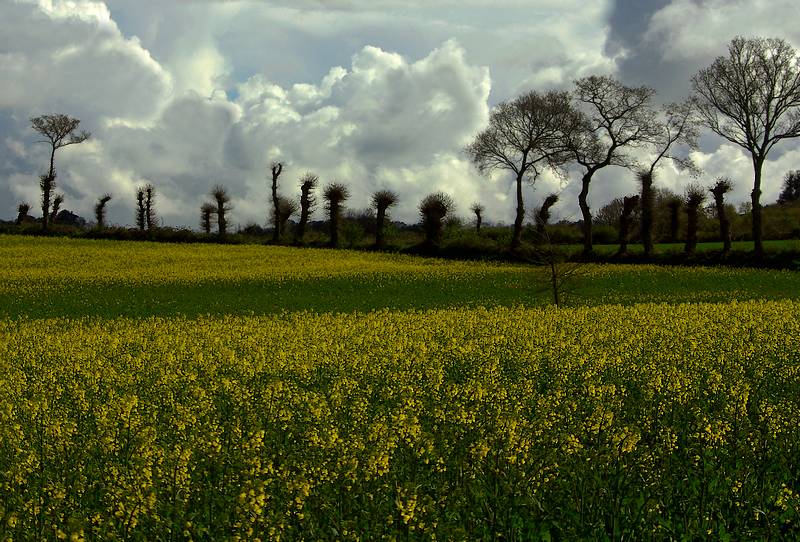 jolies couleur jaune et jeu de plan sympa (opposition entre les colzas et les arbres au fond, qui ont l'air à moitié morts ou en tout cas clairement pas en fleur)