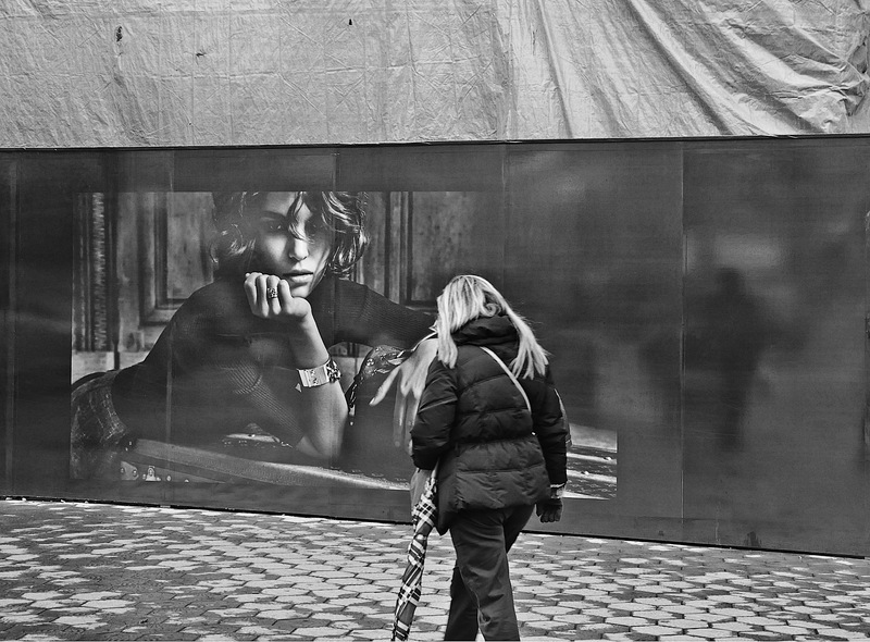 Bien vu mais les pieds de la passante auraient été un plus avec moins d'espace en haut et pourquoi pas redresser un peu et couper juste au ras de l'affiche ?