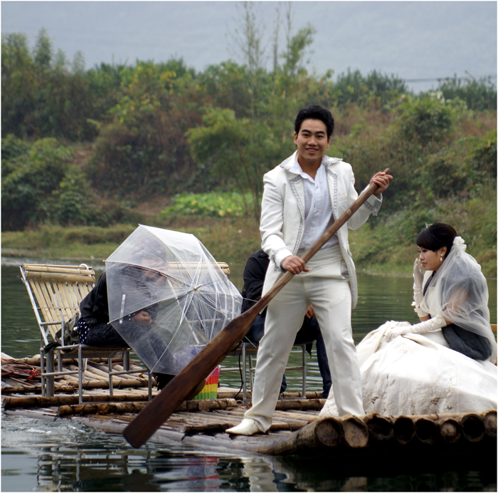 les mariés sont en blanc alors que la couleur traditionnelle des mariages en Chine est le rouge. Ces mariés faisaient une séance photo sur la rivière Li prés de Guillin dans la province du Guanxy.