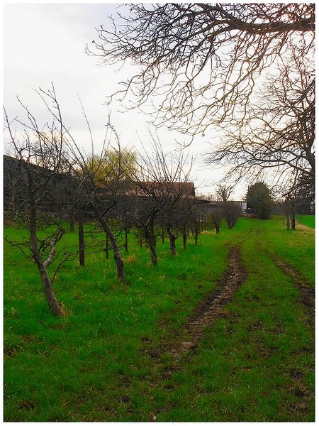 Une fois encore cela me plaît... C'est champêtre et on sent la vie qui va bientôt éclater... Dommage le ciel peu contrasté. As-tu essayé en N&B ? Peut-être que tu pourras obtenir + de contrastes et faire davantage ressortir des éléments qui te plaisent dans ce chemin des champs et des vergers.