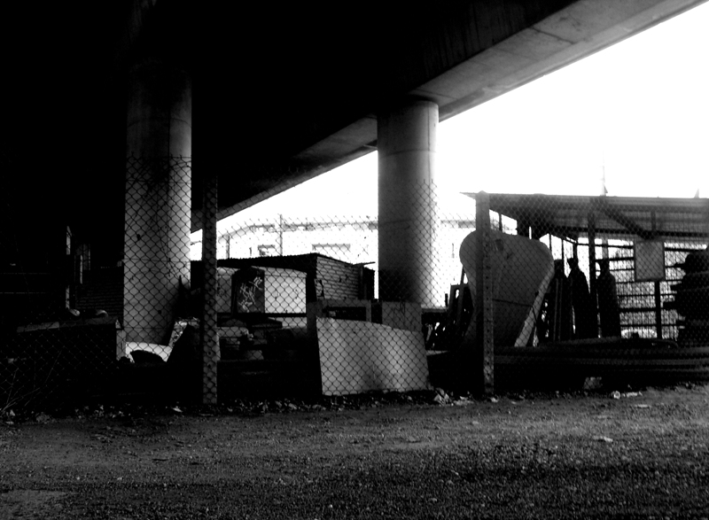 on peut voir sur la droite, une boite de climatisation à la silhouette d'un piano à queue, reposant sur trois bombonnes de gaz ressemblant elles à des Hommes. le fait d'avoir brûlé le fond permet peut-etre aussi de mieux les distinguer...