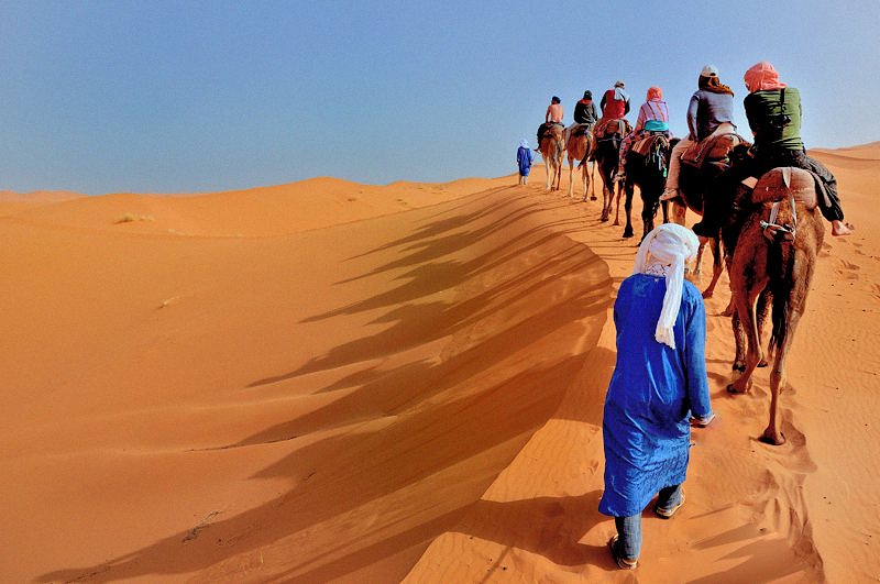 c'est partit pour une petite ballade dans l'erg chebbi de merzouga à dos de dromadadaire s'il vous plait