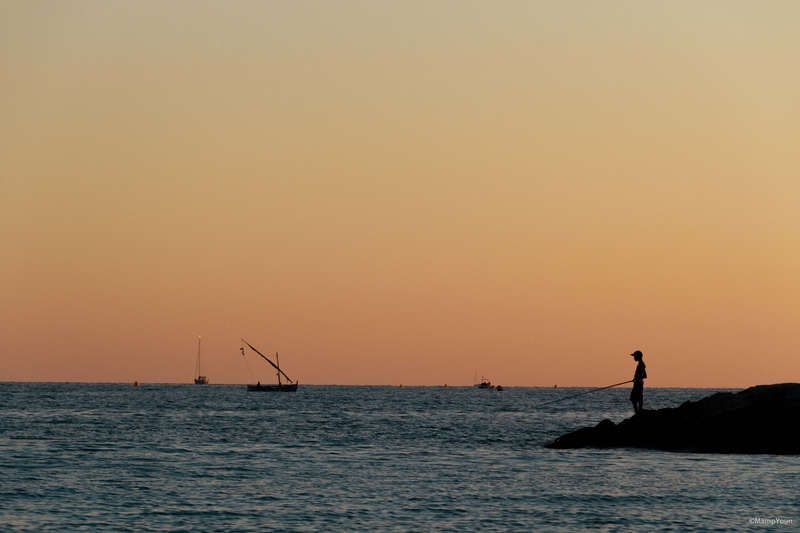 Bienvenue jolie contre jour et de belles couleurs je ne sais pas si tu avait la possibilité de te baisser un peu plus pour que le pêcheur ne soit pas couper par l horizon pas toujours le choix et en plus c est difficile de penser a tout sur le moment bravo