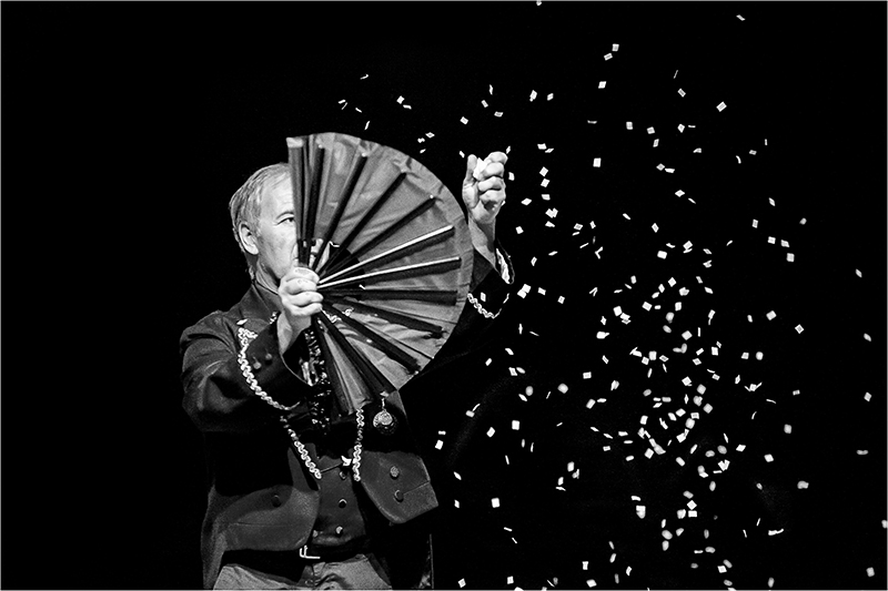 Superbe noir et blanc, netteté. concernant l'éventail qui cache le visage je ne sais pas . Je dirais que cela fait écho à la magie. le magicien nous laisse voir ce qu'il veut nous donner à voir... et tout d'un coup nos certitudes tombent