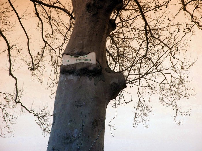 C'est super bien vu çà ! L'arbre ne semble pas souffir.Ce corps étranger fait certainement partie de lui-même aujourd'hui...