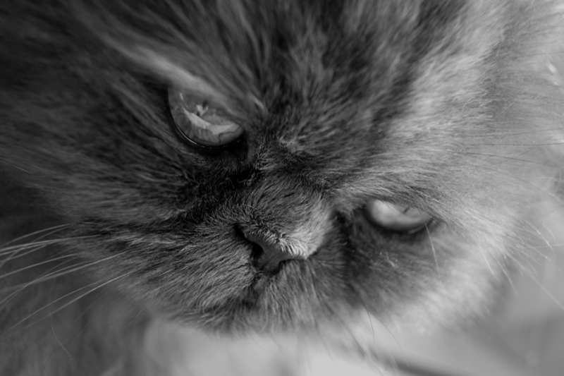 La mise au point me semble plus sur le bout du museau alors qu'elle devrait être sur les yeux. Autrement, composition intéressante et choix du N&B judicieux.