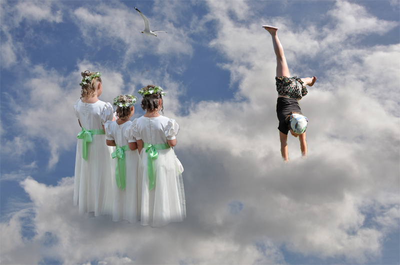 En fait, j'ai photographié les trois gamines lors d'une séance "mariage". La fillette qui fait la roue est au départ une photo souvenir, dans le jardin d'une copine. Je trouvais un intérêt aux petites filles sages et enrubannées et aussi à l'acrobate. Mais ces photos en elle-même ne présentaient pas grand intérêt. D'où l'idée de les réunir pour les mettre plus en valeur et par la même occasion m'amuser à fabriquer une image dans l'esprit "collage". Pour l'oiseau, là faut que j'interroge mon subconscient...