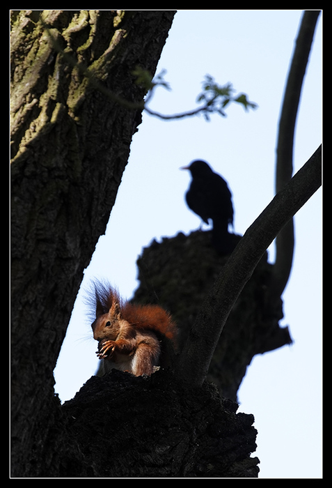 Une bien belle prise, la chance d'avoir cet oiseau en arrière plan et l’écureuil éclairé