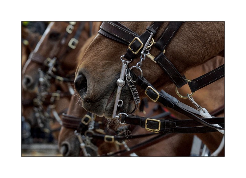 Je trouve le cadrage trop serré, le museau du cheval au second plan est bord cadre et j'aurais bien vu plus de celui du premier plan et notamment son oeil. Ca aurait donné un peu de vie à la photo. Même la bride est coupée. La narine plein cadre... bof bof .