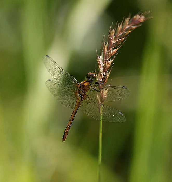 L'herbe et la femelle du Sympètre commun ont choisi des habits de couleurs identiques..