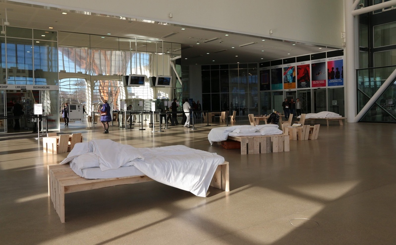 Rien à comprendre sauf à remarquer cette installation dans la grand hall d'entrée du Musée Pompidou de Metz. La sieste n'est qu'une hypothèse qui devient du coup envisageable pour les jours de grosses affluence.