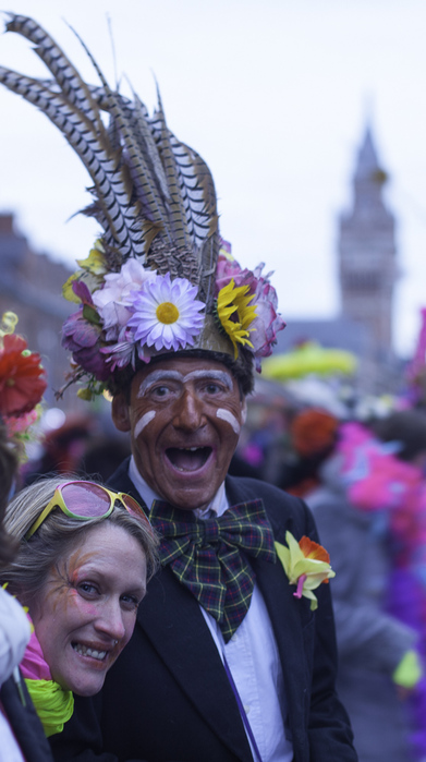 Le grand carnaval de Dunkerque...bien vue avec le beffroi de l’hôtel de ville dans le fond...