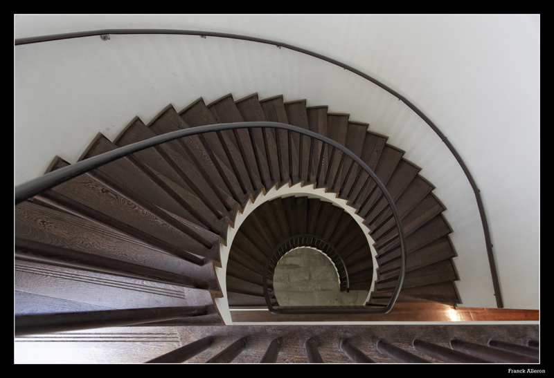 Vertige !, pas moi qui la prendrai la tête dans le vide, mais bien vu. Peut-être la partie lumineuse en bas gauche à atténuer et le point de lumière également à droite à corriger. Un beau colimaçon.