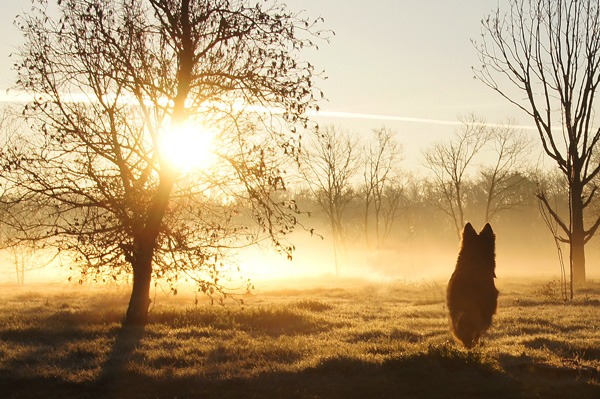 Un chien ?, une chouette?, un chouette chien dans une belle ambiance de contre-jour brumeux. Pour le cadrage un peu serré pour moi, dommage ces beaux arbres coupés