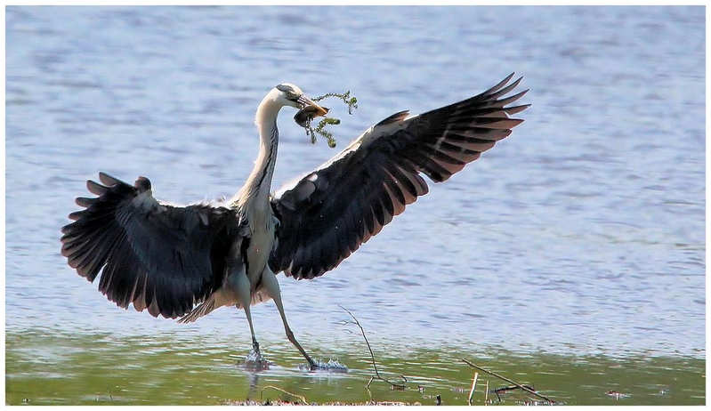 Poisson, salade au repas du jour pour ce Héron cendré...et pas question d epartager...même avec un Chevalier aboyeur.