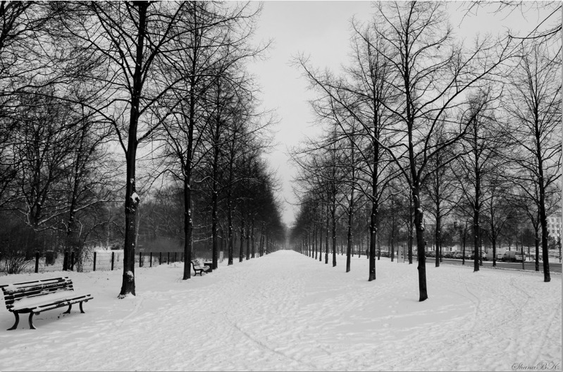 Ton cadrage basé sur le centrage de l'allée, laisse le banc trop près du cadre, je pense que 3 pas de plus dans la neige t'aurais permis de le sortir du cadre et le second banc aurait pris place entre 2 arbres.