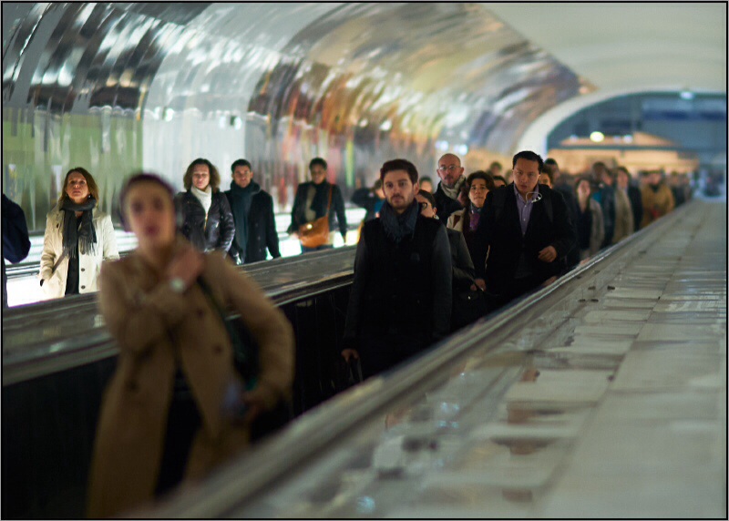 Le titre ne colle pas à ce que je vois dans ta photo. Je ne vois pas des gens presses, je ne vois pas de mouvement. Le flou est dû à une profondeur de champ réduite pas à un temps d'expo relatant la vitesse ou le mouvement.