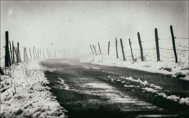 Ambiance, choix de l'angle de prise de vue, la route qui se fond au fur et à mesure dans la brume du ciel, map, PDC.