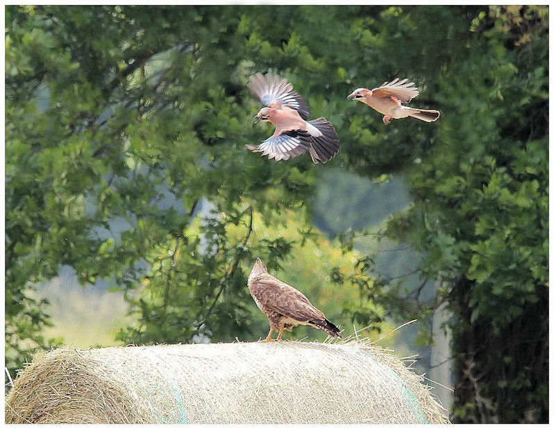 Juchée sur le ballot de foin, la Buse variable scrute dans l'herbe, à la recherche de sa proie. entrent en scène deux Geais très mécontents de cette présence. Seul ou à deux ils la provoquent..