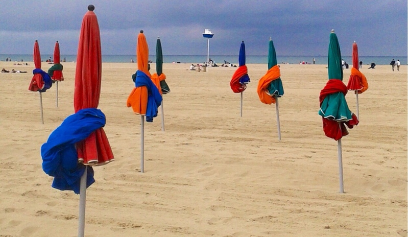 L'attaque des parasols ! J'aime beaucoup... C'est graphique, dynamique, bien composé avec ce 'grand' parasol qui occupe toute la hauteur de l'image au tiers gauche et qui entraîne le regard dans la perspective ouverte au milieu de ses camarades...