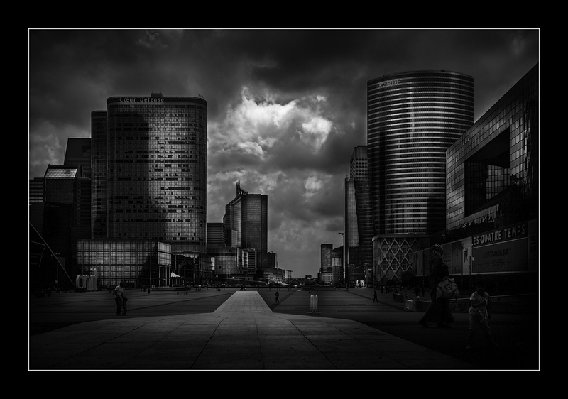 C'est en effet très dense et très dramatique, un tout petit peu trop sombre à droite là où on ne peut que deviner des personnages : il me semble que la femme qui marche pourrait faire le personnage principal de l'image, à défaut comme l'a remarqué G.tOf d'un passant bien détaché sur l'allée pavée au centre...