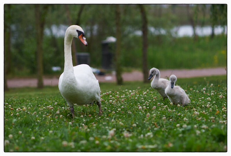 Un peu centrée sur l'axe horizontal, le fond pas très esthétique, le bec de maman flou, me ces petits sont complètement craquants avec leur démarche chaloupée.
