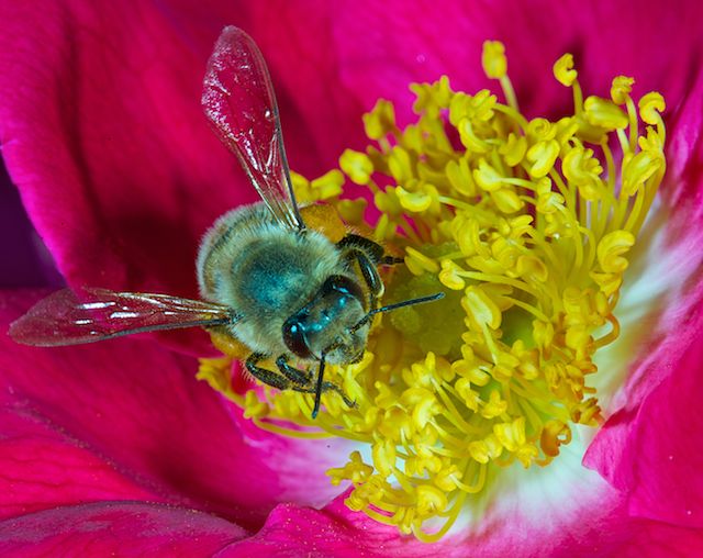 Ce portrait d'insecte pète bien et jouit d'une belle netteté : la photo a donc de l'impact, qui serait renforcé si la compo était un peu moins serré sur le cœur d'étamines...