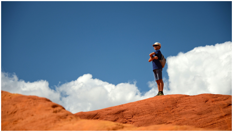 Son sac à dos alourdit un peu la silhouette du gamin mais cela reste un bel instantanée avec une jolie harmonies de couleurs bien franches entre le décor et lui et complémentaires entre elles...
