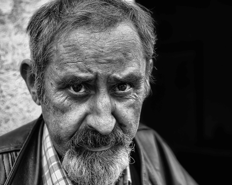 belle expression et portrait en gros plan assez fort amis cadrage trop court ou trop large : les cheveux et le bouc juste entamés par le cadre, cela ne fonctionne pas, d'autant que le regard reste ainsi centré dans la hauteur...