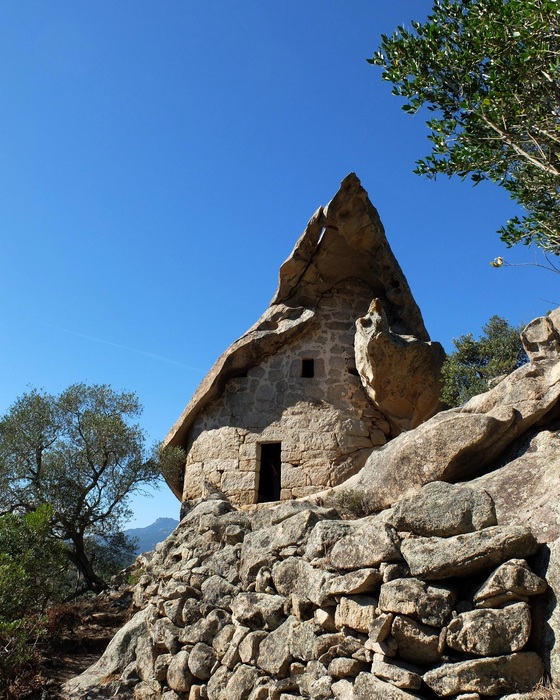 Oriu de Cani, sud Corse. Abri sous roche utilisant un creux naturel (taffoni). Celui-ci est le plus bel oriu, on l'appelle la maison des Schtroumpfs.
