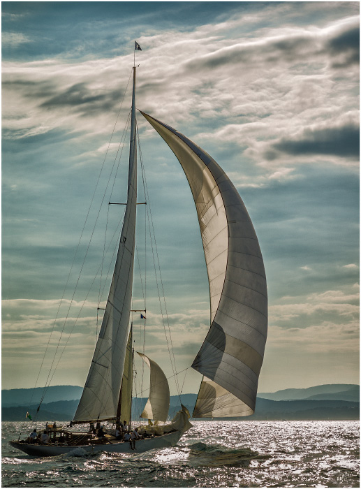 Et, les amie(s), que pensez-vous de ce vieux petit cotre houari sous spi et trinquette ballon, en contrejour de trois quarts ? Grand merci à vous.