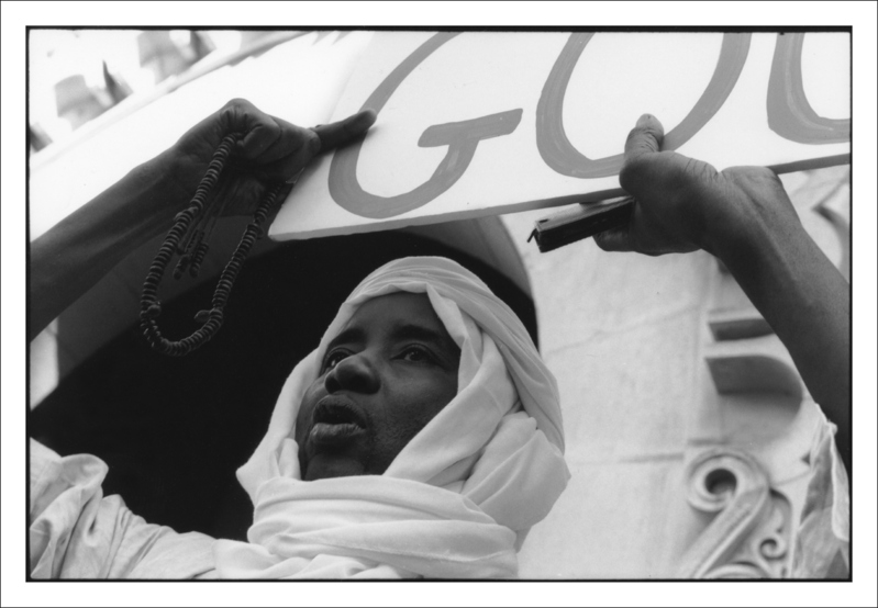 j'aime bien l'angle, le N&B et l'expression du visage (une revendication ?) Dommage qu'on ne puisse pas lire complètement le message ...
