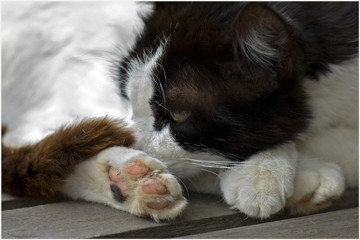 mes 13 chats ici présents saluent le squatter qui fait semblant de rien , je le vois mais qui sait aussi que le photographe n'est pas indifferent a sa présence !