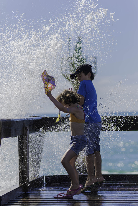 Sympa et déclenchement au bon moment ! On voit même deux comportements : une réaction de protection chez le garçon et la fillette qui joue avec les éclaboussures (c'est l'idée que je m'en fais).
