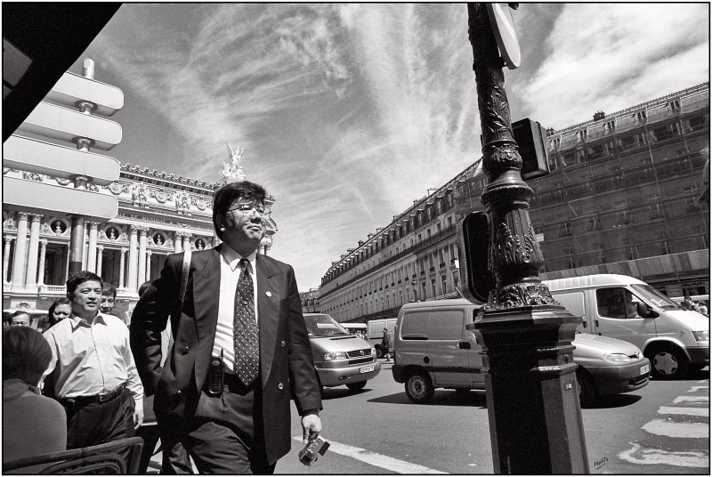 Je suis assis au Café de la Paix. Le chef de file couronné apparaît et je déclenche mon Minolta X-700, au 24 mm préréglé sur l'hyperfocale, sur du Delta 400, en mai 2001. Merci de votre bonne attention.