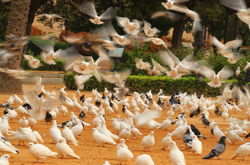 comme mes prédécesseurs Il y a 2 idées que j'aime bien La 1ère, correspondante à la moitié inférieure de la photo avec tous ces pigeons sur fond orange qui pourrait être un photo à elle seule. La 2ième, la tienne, avec les pigeons au sol et ceux en vol. Peut être avec une PDC plus courte pour plus isoler les pigeons de l'arrière plan.