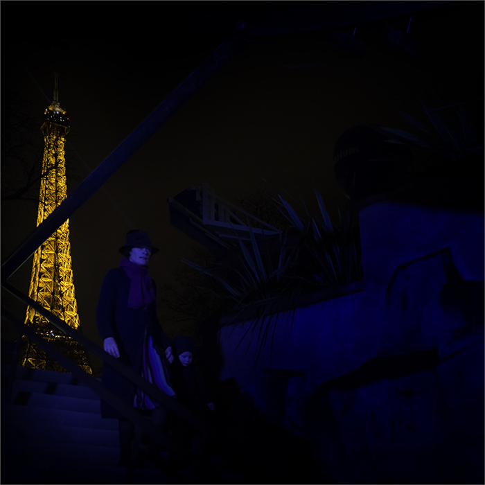 Très ésthétique cette photo. Les couleurs sont fabuleuses, ce bleu nuit qui intègre le personnage est du plus bel effet et la tout Eiffel en arrière plan est pour une fois (on en vois tant) bien à sa place.