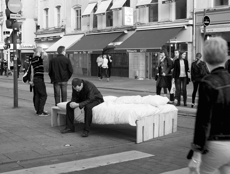 Elle me parle cette photo ! Je sais pas si je vois bien mais le gars est assis sur un plumard...Personnellement j'aurai coupé devant la personne tout à droite. J'adore vraiment cette scène avec en arrière plan la patisserie, salon de thé et surtout le club med. Si c'est un montage, et bien c'est bien joué !