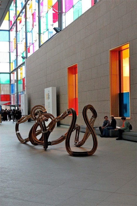 Je profite de ce post pour préciser que la coloration des parois vitrées a été mise en place selon les indications de Buren. Cela doit disparaître (dommage!) après l'expo.