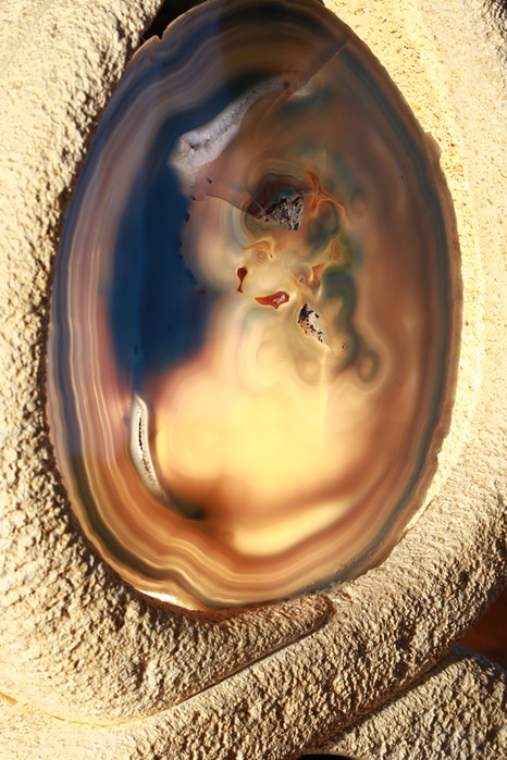 Vitrail serti entre des éléments de pierre, éclairage arrière et côté