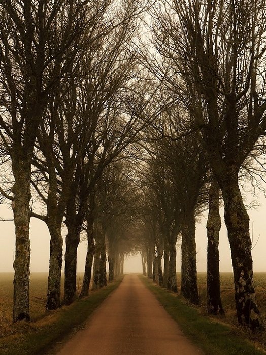 Elle me plaît bien cette allée bordé d'arbres, ce n'est pas une nationale, donc on imagine bien une petite propriété cachée dans le brouillard. Mon imagination fonctionne bien sur cette photo, je la trouve très sympa !