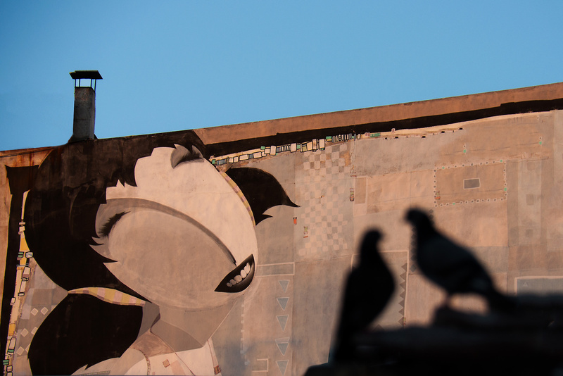 Bon coup d'oeil et bien réalisé ! Peut-être assombrir davantage les pigeons et leur socle pour accentuer l'impression d'une ombre projetée sur le mur?