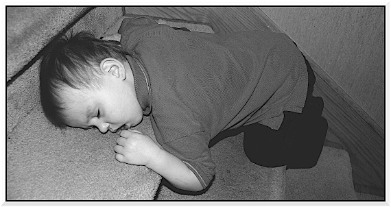 Petit Simon c'est endormi sur l'escalier après le retour d'un jeu au ballon dans les flaques d'eau... Premier beau jour de printemps à Québec aujourd'hui !