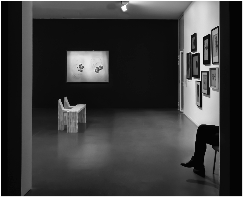 idem pour la lampe, mais superbe cette compo et j'adore juste les jambes qui suggère la présence d'un gardien du musé (voir de l'expo), lumière qui intimise le lieu et il doit y régner un grand silence (chouette ça juste pouvoir regarder admirer et le tout dans le calme et le silence