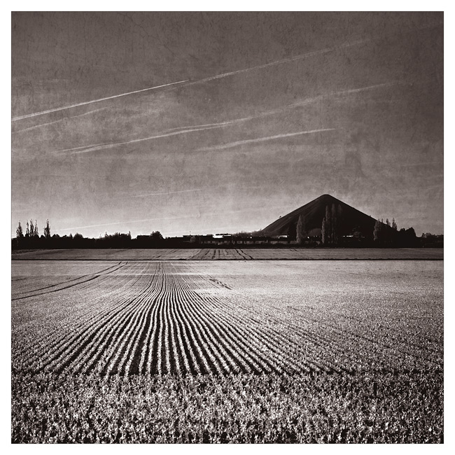 Maintenant, ce qui me plait justement ici, c'est que les lignes dans le champ rappellent la forme du terril, et que dans le même sens, ces lignes se posent sur celle qui te gêne, tout comme le terril sur l'horizon.