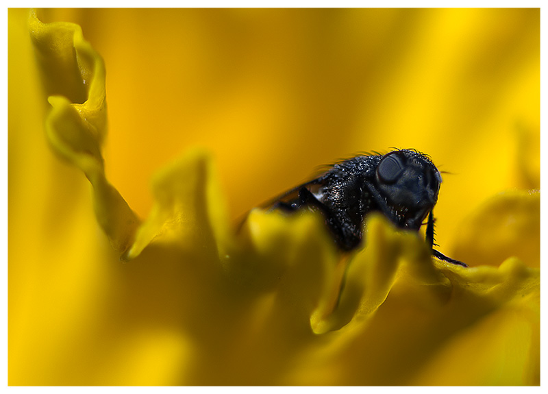 belle netteté et pdc; un impact de l'image optimun avec seulement ces deux couleurs et notament ce jaune qui fait bien ressortir l'insecte.